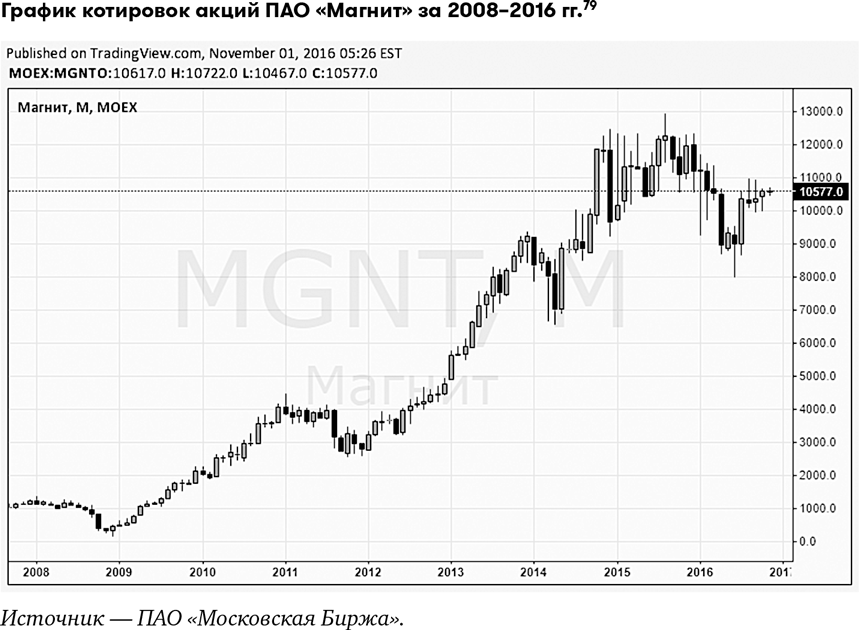 Вывод: ПАО «Магнит» – отличная, надежная компания с хорошими экономическими показателями. Но по состоянию на ноябрь 2016 г. ее акции сильно переоценены. Я бы не стал советовать их покупать, несмотря на то что они могут еще вырасти. Наши рекомендации – дождаться, пока по каким-то причинам акции подешевеют, или подыскать другие варианты для инвестиций.
