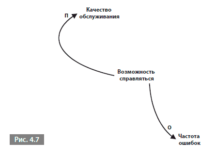 В отношении связей П и О есть еще одна тонкость, о которой мне хотелось бы сказать. Давайте еще раз посмотрим на две первые связи, которые мы рассматривали в начале истории о бэк-офисе (рис. 4.7). Как мы теперь знаем, основной способ определить, имеет ли связь тип П или О, – это задать вопрос: растет или падает качество обслуживания (или частота ошибок) с ростом возможности справляться? Поскольку оно растет и движется в том же направлении, что и возможность справляться, мы обозначаем эту связь буквой П. И наоборот, поскольку частота ошибок падает, мы обозначаем эту связь буквой О.