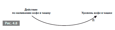 Однако бывают ситуации, в которых связь П или О работает в одном направлении, но не работает в обратном. Нам уже встречался один подобный, хотя и неявный, пример. Давайте вернемся к примеру с наливанием кофе в чашку, но вместо выражения физическоедействие позвольте мне использовать более очевидный термин действие по наливанию кофе в чашку. Это связь с уровнем кофе в чашке (рис. 4.8).