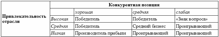 Одна ячейка обозначена «знак вопроса» (аналог «дикой кошки» матрицы БКГ). Это неопределенное, но перспективное положение в бизнесе. При поддержке эти СЗХ превращаются в «победителей», однако есть и риск их превращения в «проигрывающие». Одна ячейка называется «производитель прибыли» (аналог «дойных коров» матрицы БКГ).