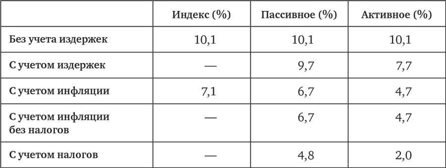 Преимущества индексирования показаны в таблице 7. Я использовал исторические данные по результатам акций крупных компаний, например, входящих в S&P 500, и предполагаемые размеры издержек. Более подробные данные приведены в приложении Б. С учетом издержек и инфляции свободные от налогообложения пассивные инвесторы получали 6,7 % годовой прибыли, то есть на треть больше, чем активные (4,7 %). С учетом налогов у активных инвесторов остается 2,0 %, а у индексаторов – 4,8 %, то есть в два с лишним раза больше.