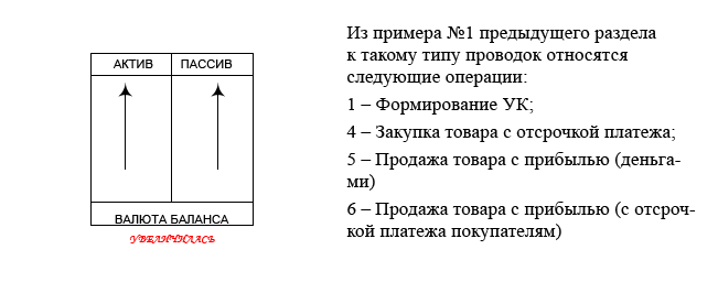 1. Показатели актива и пассива увеличиваются одновременно, при этом и валюта баланса[2] увеличивается. Схематично, это выглядит так: