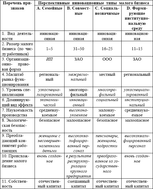 Перспективные инновационные типы малых предприятий (системообразующие признаки выделены курсивом)