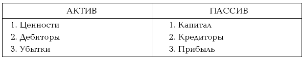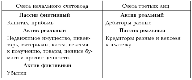 Совокупность дебетовых сальдо счетов дает представление об активной массе, состоящей в распоряжении начального счетовода. Сведения об активной массе даются счетами учета ценностей и счетами дебиторов (реальный актив); счетами финансовых результатов в части убытка (фиктивный актив). Совокупность кредитовых сальдо дает представление о пассивной массе и включает в себя остатки по счетам кредиторов, личного капитала начального счетовода (реальный пассив); счетов прибылей и счетов, регулирующих дебетовое сальдо в сторону уменьшения, как, например, торговая наценка, амортизационный капитал (фиктивные пассивы). Отсюда можно установить структуру бухгалтерского баланса. При этом результатные счета носят переходный характер и должны закрываться счетом капитала. Характерные черты построения актива и пассива начального счетовода дают возможность представить оба ряда счетов в виде таблицы (табл. 4.2).