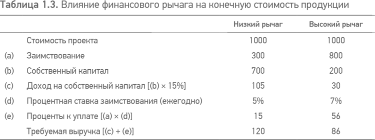Таблица 1.2 представляет (очень упрощенно) примеры выгодного использования финансового рычага для увеличения доходов инвесторов. Колонки для низкого финансового рычага и высокого финансового рычага относятся к одному и тому же показателю инвестиций в 1000, которые генерируют выручку в 100 в год. Если они финансируются с долей заимствования в 30 %, как представлено в колонке с низким финансовым рычагом (типичный уровень заимствования для хорошего корпоративного кредита), то доходность собственного капитала составляет 12 %. С другой стороны, если они финансируются с долей заимствования в 80 % (стиль проектного финансирования), то доходность собственного капитала (со сниженным уровнем) составляет 22 %, несмотря на увеличение стоимости заимствования (отражает более высокий риск для заимодавцев).