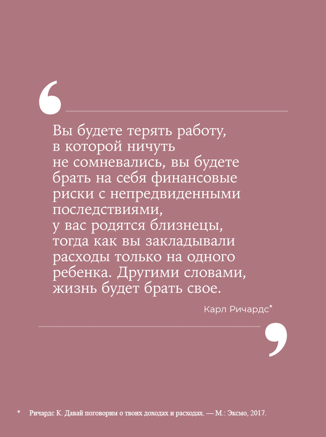 Тут многие, я уверена, представили объемную таблицу, в которой строчка за строчкой распланирована жизнь на десятилетия вперед: сколько планируете зарабатывать, сколько тратить на продукты и на путешествия, сколько и под какой процент откладывать на пенсию. Надо предположить (то есть попробовать угадать) и размер инфляции, и суммы взносов, и эффективность инвестиций.
