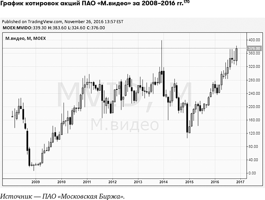 Не говоря уже о далеком 2009 г., на графике хорошо заметен период, когда акции ПАО «М. видео» были очень дешевыми. Это конец 2014-го – начало 2015 г., когда они стоили 120–150 руб. Но за два года акции стремительно выросли в цене и стали стоить почти втрое дороже. Так дорого, как в конце ноября 2016 г., они не стоили никогда прежде.