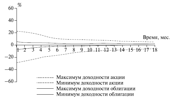 Представленные на рис. 8.12 графики показывают, что удлинение сроков инвестирования гораздо сильнее отражается в сужении спредов доходностей по акциям, чем по облигациям. Однако наличие на рынке ситуации ярко выраженного падения котировок акций в условиях кризиса приводит к тому, что на любом рассматриваемом временном интервале разброс максимальных и минимальных доходностей по акциям выше, чем по облигациям. При этом математическое ожидание доходности акций расположено всегда выше аналогичного параметра для облигаций, но разница между этими показателями для акций и для облигаций небольшая. В то время как значения стандартного отклонения доходности для акций возросли значительно больше, чем для облигаций.