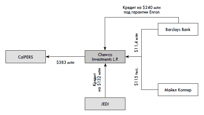 Компания Chewco была организована в форме партнерства с ограниченной ответственностью. Коппер внес $115 тысяч собственных средств и стал управляющим партнером Chewco, т. е. получил право подписывать юридические документы. Вторым партнером стал Barclays Bank, который внес в общей сложности 11,4 млн (суммарно получилось как раз 3 % общего капитала Chewco, что было необходимо для оставления Chewco за балансом Enron). Однако инвестиции Barclays в Chewco были не акционерным капиталом Chewco. По сути они представляли собой тот же кредит, юридически оформленный как взнос в партнерство.