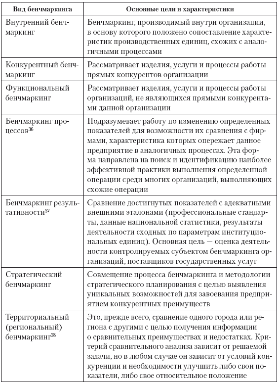 Следует отметить, что различные виды бенчмаркинга могут применяться как вместе, так и по отдельности. При этом исследования показывают, что для разных видов деятельности применяются разные виды. Так, например, бенчмаркинг результативности часто применяется при оценке качества предоставления государственных услуг, процессный бенчмаркинг – в управлении человеческими ресурсами и т. д. Однако решение о выборе того или иного вида следует принимать в каждом конкретном случае индивидуально, исходя из целей и задач стратегического управления в целом и контроля в частности. Рассмотрим обозначенные виды бенчмаркинга более подробно.