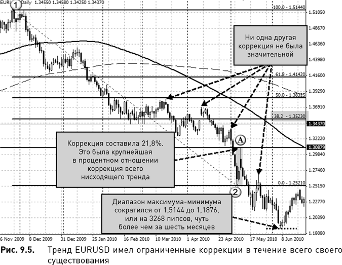 • за исключением первой коррекции в самом начале тренда, на протяжении всего движения вниз не было ни одной значительной коррекции. Крупнейшей коррекцией стало восстановление на 21,8 %, которое в течение двух торговых дней подвинуло цену с 1,2510 (точка 2 на рис. 9.5) до 1,3093 (точка А), прежде чем возобновилось движение вниз;