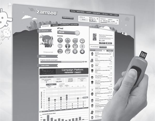 Рис. 9.4. Датчик Zamzee отслеживает все перемещения детей и позволяет им просматривать свою статистику, видеть прогресс и соревноваться друг с другом