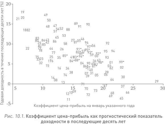 Динамика изменения фондового индекса во многом зависит от уровня прибыли, и он колеблется в зависимости от долгосрочности тренда роста прибыли, который со временем разворачивается в обратную сторону. На рис. 10.1 представлена точечная диаграмма, где горизонтальная ось – коэффициент цена-прибыль на январь каждого года (с 1881 по 1995 г.), а вертикальная ось – годовая доходность фондового рынка (скорректированная на инфляцию) в течение последующих десяти лет. Эта точечная диаграмма дает нам возможность увидеть, насколько коэффициент цена-прибыль определяет прогноз уровня доходности на десятилетие вперед. Здесь представлены данные только на январь, поскольку если бы мы разместили на графике данные по всем 12 месяцам за каждый год, то из-за большого количества точек его невозможно было бы прочесть. Вследствие такого упрощения мы, безусловно, теряем большинство максимумов и минимумов на рынке. Например, у нас нет пика рынка 1929 г., как и отрицательной доходности, последующей за ним. Показатели коэффициента цена-прибыль, указанные на рис. 10.1 и 1.3 идентичны. Год обозначен двумя последними цифрами, а годы XIX в. еще и звездочкой (*){273}.