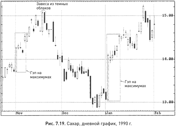На рисунке 7.19 можно увидеть, как в конце октября – начале ноября группа из трех свечей с маленькими телами помогла рынку «переварить» результаты бурного подъема накануне. Затем на графике образовалось окно вверх и таким образом сложилась модель продолжения тенденции «гэп на максимумах». Рост продлился до появления завесы из темных облаков 17 и 18 ноября, а в январе возник еще один гэп на максимумах. Границы окна, входящего в состав этой модели, в дальнейшем выступили областью поддержки.