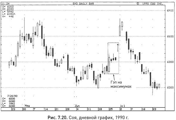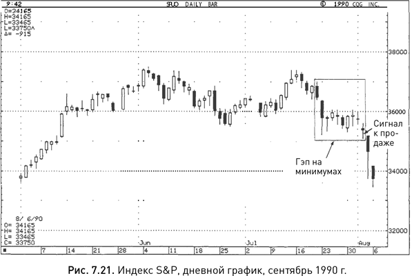 Как показано на рисунке 7.21, индекс S&P упал на 18 пунктов 20 и 23 июля 1990 г., а затем больше недели колебался в боковом диапазоне (модели «гэп на максимумах» и «гэп на минимумах» предполагают, что консолидация рынка должна продолжаться не более 11 торговых сессий). Знакомый брокер, о которой я рассказывал в начале книги, сообщила мне, что один из ее клиентов в Японии, управляющий инвестиционным фондом, 2 августа на основании модели «гэп на минимумах» получил сигнал к продаже. Это еще раз возвращает нас к тезису о том, что в свечном анализе не существует строгих правил, есть лишь рекомендации. В данном случае модель «гэп на минимумах» была неидеальной, поскольку окно, строго говоря, на графике не образовалось: 1 августа рынок опускался до 355,8 пункта, а 2 августа торги начались чуть выше – на отметке 355,9. Кроме того, 23 июля, когда сформировалась длинная черная свеча, торги завершились не на минимальных отметках сессии, а выше, хотя в дальнейшем цена оставалась в нижней части диапазона. В целом сложившаяся на графике комбинация свечей напоминала гэп на минимумах, и для японского управляющего этого оказалось достаточно, чтобы считать модель завершенной.