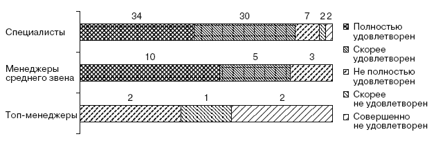 Среди тех, кто не удовлетворен или частично не удовлетворен начальством, преобладают топ-менеджеры и менеджеры среднего звена, что говорит о наличии проблем соподчинения на уровне самой управленческой верхушки холдинга (рис. 2.24).