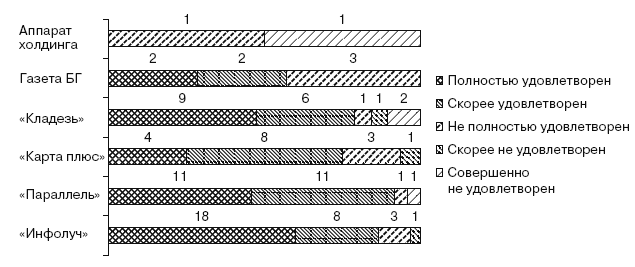 В компании «Карта плюс» сотрудники не полностью удовлетворены главным редактором: так ответили три респондента. В редакции газеты «Барский газовик» также три респондента не полностью удовлетворены своим главным редактором. Наконец, в ТРК «Кладезь» два человека высказали недовольство (один – не полную удовлетворенность, другой – совершенную неудовлетворенность) режиссером ТРК. В ТРК «Инфолуч» отсутствует более-менее массовая неудовлетворенность кем-то из руководителей (если и есть, то ее выражает один человек). То же касается и ТРК «Параллель».