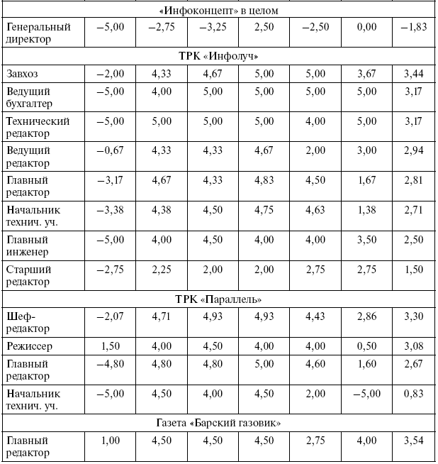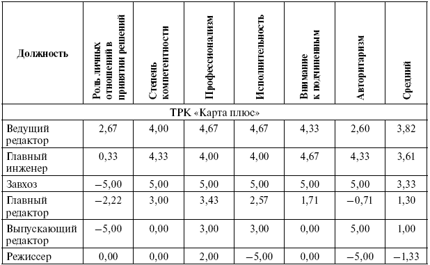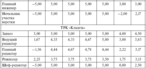 Из данных табл. 2.3 видно, что самых низких оценок удостоились генеральный директор «Инфоконцепта» и режиссер ТРК «Карта плюс».