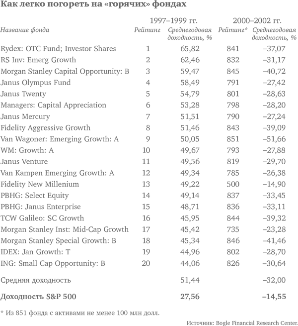 Недавние результаты превосходно демонстрируют эфемерность инвестиционной доблести активных фондов. В приведенной ниже таблице показана двадцатка лучших взаимных фондов за период 1997–1999 гг. Финансовая пресса писала, что именно их «следует покупать в новом тысячелетии». Их доходность вдвое превышала доходность рынка в целом. Кто захочет покупать скучный индексный фонд, имея возможность доверить свои деньги настоящим гениям? И большинство новых вкладчиков несли деньги именно в эти «горячие» фонды. В той же таблице приводятся данные о доходности этих фондов в следующем трехлетнем периоде 2000–2002 гг. Вчерашние гении совершенно перестали чувствовать рынок. Доходность фондов оказалась в этом периоде вдвое ниже, чем у рынка в целом, а их инвесторы понесли значительные убытки.