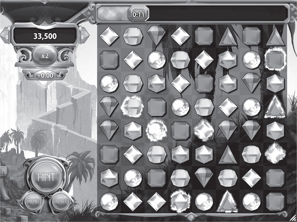 Рис. 1.2. В Bejeweled Blitz игрокам нужно собирать вместе камни разного цвета. Игра кажется простой, но такие механизмы, как мастерство, вызовы, очки и уровни, точно отрегулированы для обеспечения максимальной вовлеченности