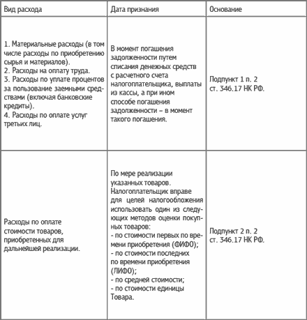 Специальные правила признания расходов действуют в отношении отдельных видов затрат, указанных в п. 2 ст. 346.17 НК РФ. Например, материальных, на оплату труда и т. д. Приведем их в таблице.