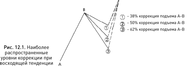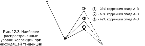 Обычно рынок движется вверх или вниз не по прямой, а ступенчато, на время отступая назад, прежде чем продолжить основное движение. Наиболее распространенными уровнями таких коррекций (retracement levels) являются 50 %-ный, а также 38 %-ный и 62 %-ный, которые соответствуют коэффициентам Фибоначчи (см. рис. 12.1 и 12.2). Фибоначчи жил в ХIII в. и был математиком, открывшим особую числовую последовательность. Не вдаваясь в подробности, напомним, что результат деления определенных чисел дает коэффициенты, названные по имени их первооткрывателя, в том числе коэффициенты 61,8 % и 38,2 %. Округленные значения данных чисел являются одними из самых известных уровней коррекции. Но, пожалуй, пристальнее всего участники рынка следят за 50-процентным уровнем: он не только совпадает с одним из коэффициентов Фибоначчи, но еще и используется приверженцами теорий Ганна, Доу и волн Эллиотта.