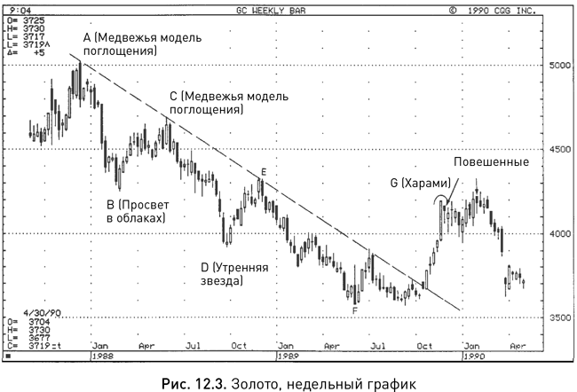 Уровень сопротивления, соответствующий 50 %-ной коррекции после снижения от Е к F, составлял $395. Почему же не стоит удивляться, что цены в итоге перешагнули его вверх? Потому что в конце 1989 г. была прорвана двухгодичная линия сопротивления, отмеченная на графике пунктиром. Более того, в этот период сформировалось двойное основание на отметке $357. Следовательно, нужно было ожидать 50 %-ной коррекции в рамках более долгосрочного нисходящего тренда – от максимума 1987 г. в области А до минимума 1989 г. в области F. Уровень сопротивления в этом случае должен находиться у $430. В конце ноября в области G на отметке $425 рынок подал два сигнала о нестабильности восходящего движения: во-первых, возникла модель «харами», а во-вторых, в ее состав вошел повешенный. Спустя некоторое время максимумы свечи за неделю с 22 по 26 января слегка превысили $425, однако на следующей неделе появился еще один повешенный, и после этого рынок пошел вниз.