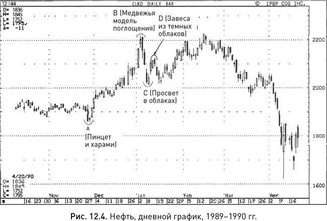 Коррекция 1. В конце 1987 г. в области А были достигнуты максимумы на отметке $502, и при этом образовалась медвежья модель поглощения. Начавшееся затем снижение завершилось с образованием просвета в облаках в области В на уровне $425. При 50 %-ной коррекции после спада от А к В сопротивление должно было проходить примерно на $464 – эта цифра получена путем прибавления к цене в точке В половины разности между ценами в точках А и В. Вблизи $464 следовало ожидать медвежьего свечного индикатора, который подтвердил бы наличие там сопротивления. Таким индикатором в области С оказалась медвежья модель поглощения, у которой максимум составил $469 – всего на $5 выше уровня 50 %-ной коррекции. Затем рынок вновь устремился вниз.
