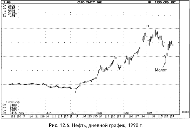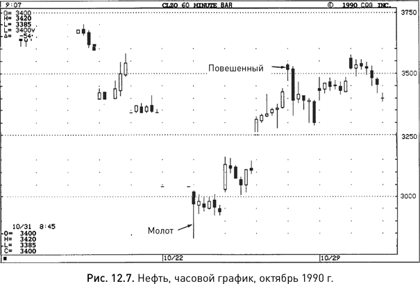 Как можно видеть на рисунке 12.6, от июльского минимума L до октябрьского максимума Н цены на нефть поднялись на $21,7. Коррекция на 50 % после этого подъема соответствовала $29,05, поэтому рынок должен был нащупать в этом районе поддержку в ходе начавшегося снижения. Так и произошло: 23 октября цены достигли локального минимума на отметке $28,3, сформировав молот, а затем рынок подрос более чем на $5. На часовом графике нефти (см. рис. 12.7) в самом начале торгов 23 октября также образовался молот, т. е. свеча этого типа возникла в один и тот же день на графиках разного таймфрейма. Это редкое и, как нетрудно догадаться, важное совпадение. Обратите внимание, что на часовом графике быстрый подъем, начавшийся с молота, исчерпал себя 26 октября, когда возник повешенный.