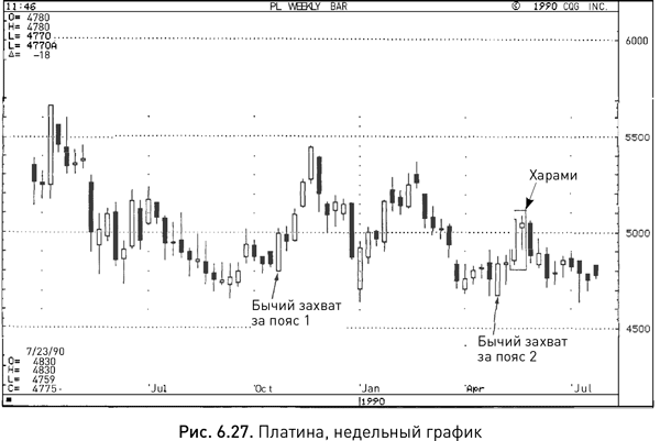 На рисунке 6.27 первая свеча «бычий захват за пояс» успешно предсказала ралли, а вторую стоит рассмотреть повнимательнее: она завершила формирование основания «пинцет», поскольку цена опускалась до минимумов предыдущей недели. За этой свечой последовал период роста, завершившийся образованием модели «харами».
