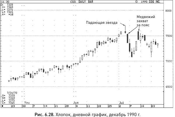 Падающая звезда на рисунке 6.28 давала быкам первый повод для беспокойства, и уже на следующий день медвежий захват за пояс подтвердил образование вершины. Еще одна свеча этого типа возникла через неделю, подтвердив сохраняющуюся слабость рынка.