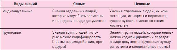 Отношение к явному и неявному знанию со стороны коммерческих организаций весьма противоречиво. С одной стороны, многие организации стремятся перевести неявное знание в явное. Это делается для того, чтобы не зависеть от отдельных личностей и продублировать значимые достижения. В то же время эти организации не заинтересованы в том, чтобы основные конкурентные преимущества перешли в форму, готовую для дублирования. Именно поэтому многие организации стараются сохранять некоторые из своих конкурентных преимуществ в тех формах, которые не поддаются дублированию (специфические тренинги, корпоративная культура, специальные системы обслуживания и пр.). Основные виды знаний (явные и неявные, индивидуальные и групповые) представлены в табл. 3.2.