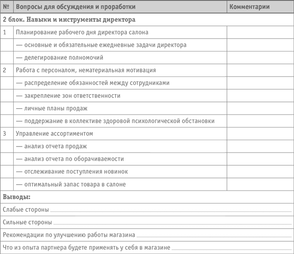 Любой вид анализа заставляет думать, структурирует наши познания. А в результате обмена опытом по партнерской программе прибавляются чужие знания, наработки и достижения. Кстати: когда директорам разослали график посещения магазинов, они перед приемом коллег стали проводить генеральные уборки. Никто не хотел ударить в грязь лицом перед партнерами и подвести своих территориальных менеджеров.
