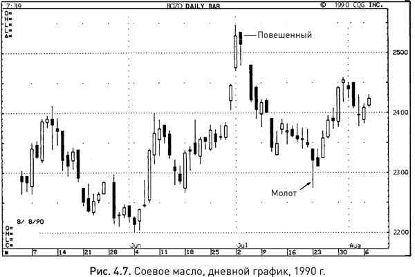 Рисунок 4.7 наглядно показывает, что одинаково выглядящие свечи бывают как медвежьими сигналами, так и бычьими. В данном случае и у повешенного (свеча от 3 июля), и у молота (свеча от 23 июля) тело черное, но цвет не имеет большого значения.