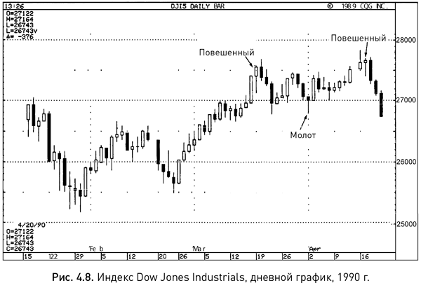 На рисунке 4.8 также видна двойственная природа этих свечей. В середине апреля появление повешенного предупредило об окончании ралли, стартовавшего с бычьего молота 2 апреля. Кроме того, в середине марта на графике сформировалась свеча, которую можно считать разновидностью повешенного. Тело у нее находится в верхней части дневного диапазона, верхняя тень почти отсутствует, а нижняя хотя и довольно длинная, но не превышает длину тела в два раза. Медвежий характер этого сигнала подтвердило то, что на следующий день торги завершились на отметке ниже предыдущей цены закрытия. Как видно на графике, восходящая тенденция после этого прервалась, то есть сигнал оказался верным, хотя повешенный и отличался от идеала. Все-таки инструменты свечного анализа, как и других графических методов, подчиняются определенным закономерностям, а не строгим правилам. Данный пример показывает, что длина нижней тени у повешенного необязательно должна быть вдвое больше тела, чтобы свеча служила сигналом разворота. Однако чем длиннее нижняя тень, тем совершеннее будет модель.