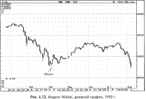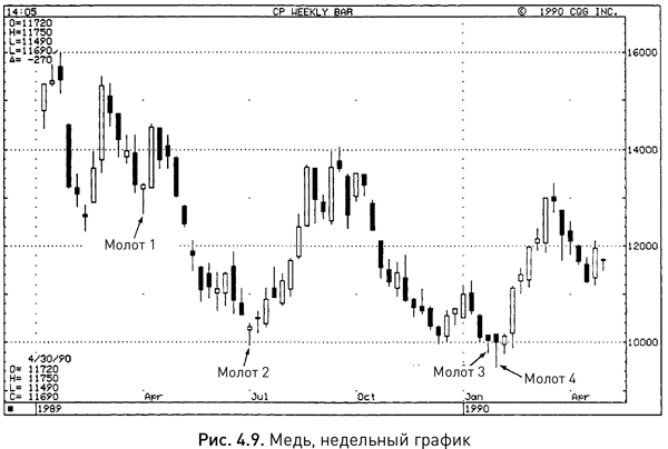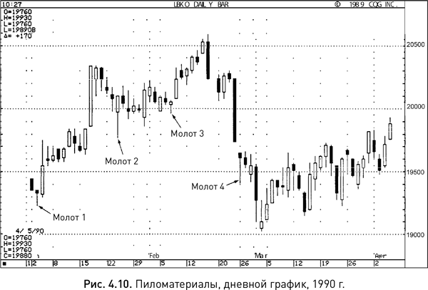 На рисунке 4.9 вы найдете серию бычьих молотов, обозначенных номерами от 1 до 4 (свеча 2 считается молотом, несмотря на наличие у нее крохотной верхней тени). Обратите внимание на сигналы к покупке, появившиеся в начале 1990 г. Накануне цены обновляли минимумы, достигнув отметок июля 1989 г. – периода, когда на графике образовался молот 2. На какое-то время мяч оказался в руках медведей, однако нисходящая тенденция не получила продолжения: два бычьих молота (3 и 4) указывали, что медвежья атака не удалась и быки перехватывают инициативу. У молота 3 длина нижней тени не превышала тело в два раза, как требуется, однако вслед за ним на графике возник более совершенный молот 4, который подтвердил высокую вероятность разворота рынка в основании.