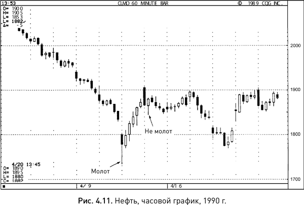 Внутридневные свечные графики строятся аналогично дневным и недельным. Например, часовые свечи отражают максимумы, минимумы, цены открытия и закрытия каждого часа. Рассмотрите внимательно молот на рисунке 4.11, возникший в первый час торгов 11 апреля. Как и молот 4 на рисунке 4.10, он образовался после гэпа вниз, но в данном случае за ним последовала белая свеча с ценой закрытия выше, чем у самого молота, что подтвердило завершение нисходящего тренда.