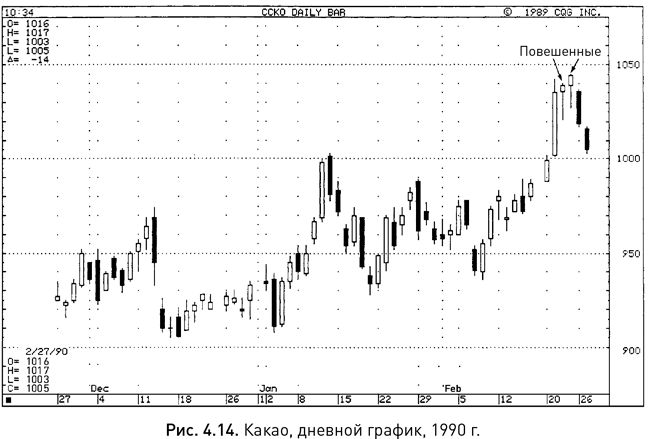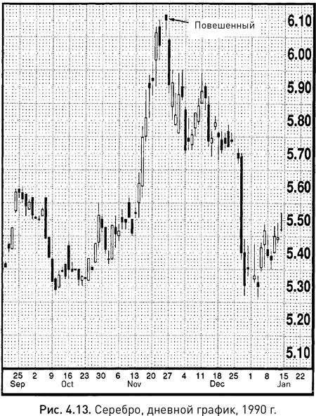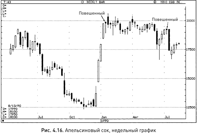 На рисунке 4.16 показано чрезвычайно резкое повышение цен на апельсиновый сок в конце 1989 г. – начале 1990 г., которое прервалось после того, как на графике возник повешенный. Этот пример подтверждает, что модель разворота необязательно предвещает смену тренда на противоположный: как уже отмечалось в главе 3, она лишь сигнализирует о завершении предыдущего тренда. В данном случае восходящая тенденция сменилась боковым движением, но не перешла в снижение. Еще один повешенный возник на этом графике в июле, и вот здесь уже события развивались иначе – характер рынка резко поменялся с бычьего на медвежий.