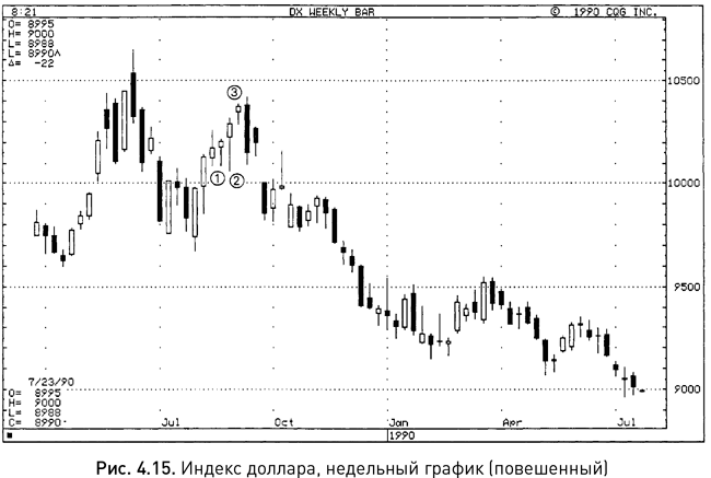 Рисунок 4.15 иллюстрирует еще один способ убедиться, что рынок действительно готов к снижению, – проверить, не идет ли следом за повешенным черная свеча, у которой цена закрытия ниже, чем у повешенного. Так, свечи 1, 2 и 3 представляют собой серию повешенных. Однако в первых двух случаях отсутствие подтверждающих сигналов свидетельствовало о том, что восходящая тенденция остается достаточно сильной. А вот после повешенного 3 сформировалась черная свеча: хотя открылся рынок практически на прежнем уровне, цена закрытия оказалась уже гораздо ниже, поэтому все, кто совершал покупки неделей ранее, ушли в минус.