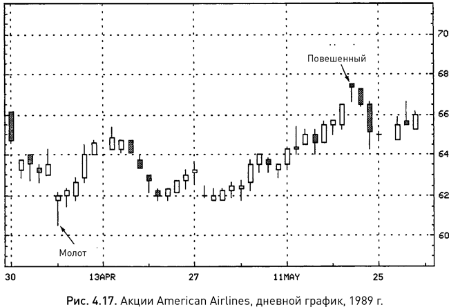 На рисунке 4.17 можно видеть классического повешенного, возникшего в мае, – с очень маленьким телом, длинной нижней тенью и отсутствующей верхней тенью. Черное тело свечи, появившейся на следующий день, свидетельствовало об истинности медвежьего сигнала и о том, что настало время закрывать длинные позиции. Также обратите внимание на бычий молот, который возник на этом графике в начале апреля.