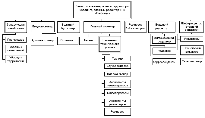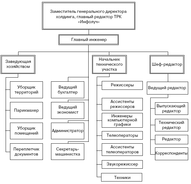 Применяемая организационная структура относится к классическим вертикальным структурам и предполагает строгое вертикальное бюрократическое подчинение и единоначалие. Такая структура оптимальна для стабильного типа компаний, производящих один и тот же продукт без изменений и имеющих большой штат персонала. Для ТРК, в которой работает 40–50 человек, такая структура не является оптимальной, поскольку решения принимаются медленно, крайне сложно согласовываются различными управленческими звеньями. Мы наблюдаем как минимум три уровня иерархии начальников. В этой системе телевизионное производство, ориентированное на оперативное согласование решений, быстрое их принятие и т. д., работает недостаточно эффективно, так как не позволяет гибко менять структуру и создавать новые проекты, быстро принимать решения и транслировать их персоналу.