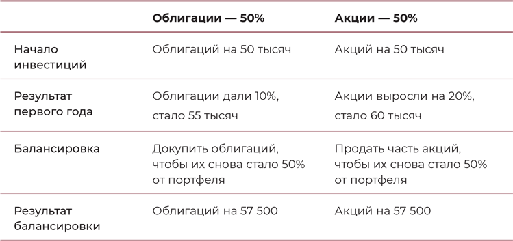 Через год опомнились, смотрите, что там. Облигации дали свои 10 %, а акции – целых 20 %. Теперь у вас облигаций на 55 тысяч, а акций на 60 тысяч. Всего бумаг на 115 тысяч. Надо снова привести портфель к пропорции 50/50; для этого вы продаете часть облигаций и докупаете акций, чтобы стало по 57 500 на каждый тип бумаг.