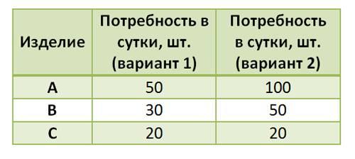 Рассматривая второй вариант задачи, можно увидеть, что логика абсолютно повторяется. Время такта для каждого изделия: А=480/100 = 4,8 минут, В=480/50 = 9,6 минут, С=480/20 = 24 минуты.
