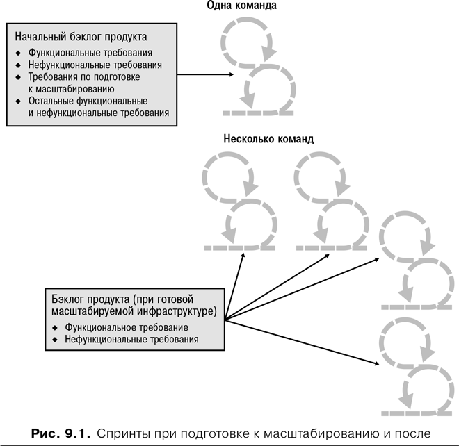 На рис. 9.1 представлен начальный бэклог продукта с нефункциональными требованиями для подготовки планируемой инфраструктуры. Владелец продукта и команда разработки собираются вместе на планировании спринта, обсуждают и выбирают подходящую комбинацию функциональных и нефункциональных требований. Команда работает столько спринтов, сколько требуется для подготовки инфраструктуры. После этого в проект вводятся дополнительные команды. В состав каждой новой команды входит участник первоначальной команды, чтобы выступать в роли эксперта по инфраструктуре и архитектуре проекта. Каждая команда проводит планирование очередного спринта.