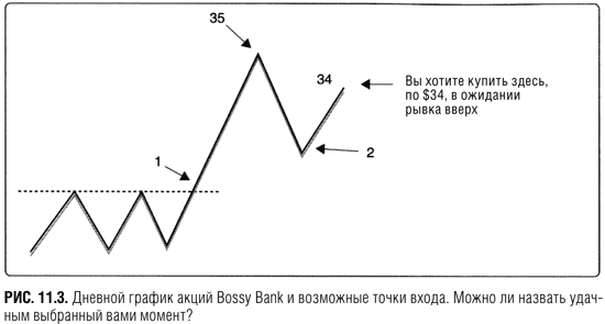 К этому моменту сработали все сигналы на покупку. Условия 1 и 2 выполнены, и теперь ваши акции Bossy Bank двигаются вверх после первого отскока и направляются к предыдущему максимуму, образовавшемуся на прошлой неделе. Рынок преисполнен оптимизма, финансовые показатели отличные, и у вас чешутся руки спустить курок на отметке $34, увеличив позицию, пока Bossy не проскочил через $35.