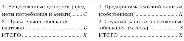 Общая сумма ценностей, находящихся в хозяйстве, образует его капитал, который может быть двоякого рода: предпринимательским – принадлежащим хозяину и ссудным – принадлежащим другим лицам. Сопоставляя виды капитала с установленной классификацией ценностей, Сивере обосновывает структуру баланса (табл. 4.9).