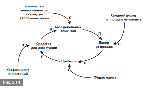 В отличие от нее, диаграмма на рис. 5.13 не содержит явных свободных звеньев. Эти звенья скорее подразумеваются: даже без них мы узнаем усиливающую петлю и демонстрируемый ею экспоненциальный рост или упадок.