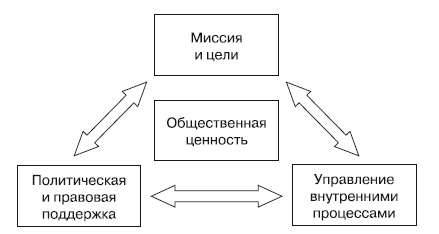 На рис. 18 миссия – это причина существования организации в данный момент, а цели – результаты, которых необходимо достичь в будущем для осуществления этой миссии. Политическая и правовая поддержка предполагает согласование интересов государственных служащих с мнением заинтересованных лиц. Управление внутренними процессами подразумевает организацию работ по реализации стратегии. Поэтому общественная ценность увеличится только в том случае, если все три элемента стратегического треугольника, изображенного на рис. 18, будут учтены в стратегических решениях руководства24.
