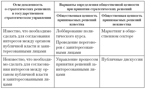 Поэтому общественная ценность воспринимается скорее как философия, чем строгое руководство к действию. Однако ценность органа публичной власти не может быть увеличена только благодаря рутинному исполнению стандартных функций, на которые делает упор направление «нового государственного управления» (NPM). Потребности граждан и цели заинтересованных лиц меняются, что следует учитывать в деятельности государственной организации, поэтому именно стратегический подход реально отвечает на новые вызовы в государственном и региональном управлении. В пользу приведенного аргумента говорит изложенная в данном разделе концепция и ее применение в практической деятельности, отдельные примеры которой будут приведены в следующем разделе.