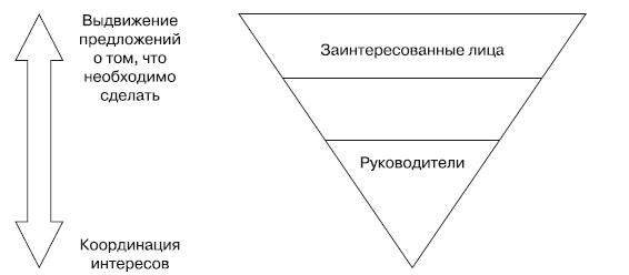 Руководству в ходе разработки проекта оптимизации внутренних процессов необходимо учитывать ценности, которых придерживаются служащие государственной организации. Поэтому в исследуемой нами концепции управление осуществляется на принципах децентрализации: максимально учитываются мнения линейных работников для координации их интересов; схематично данная ситуация показана на рис. 20.